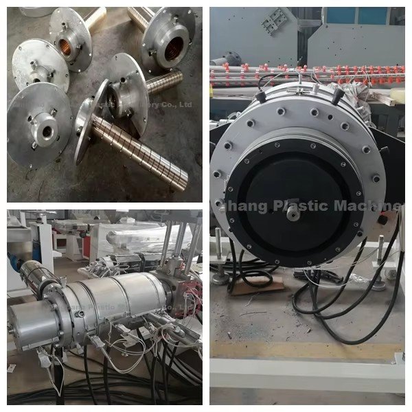 Он производит одноцветные трубы с помощью монохромного экструдера, а многоцветные трубы — с помощью нескольких экструдеров и соэкструзионной головки и пресс-формы. Его также можно использовать для производства труб большого диаметра, таких как водопроводные и газовые трубы.